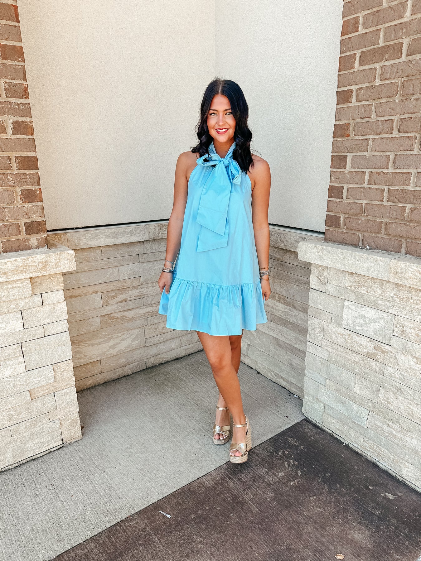 Blue Bow Neck Detail Mini Dress