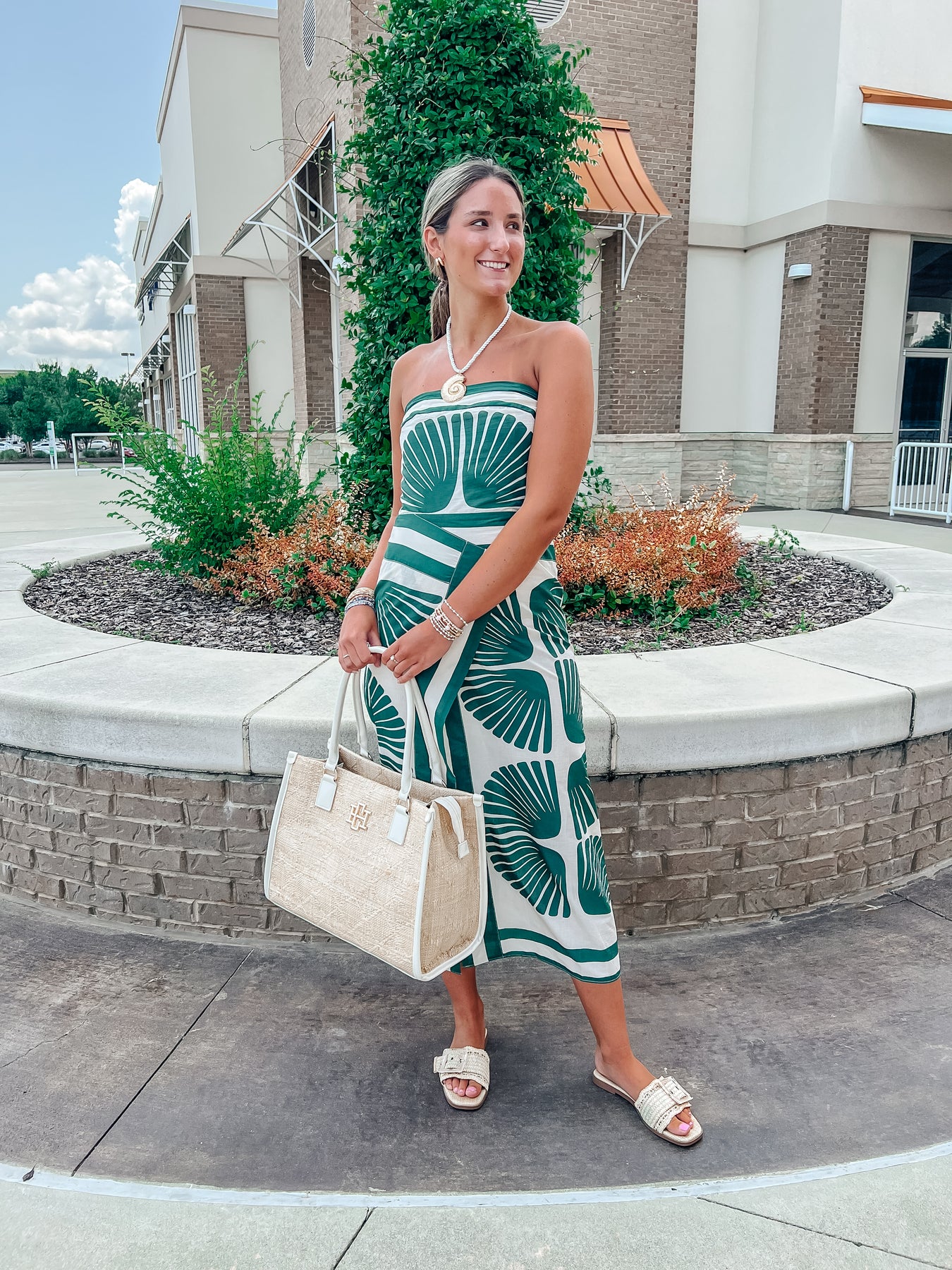 Turn heads this summer with our Tessa Tropical Midi Dress — a bold, breezy look made for sunshine and statement moments. Featuring a strapless neckline and an eye-catching green palm leaf print, this dress hugs your silhouette in all the right places while keeping things cool and effortless. Perfect for everything from beachside brunch to rooftop cocktails.