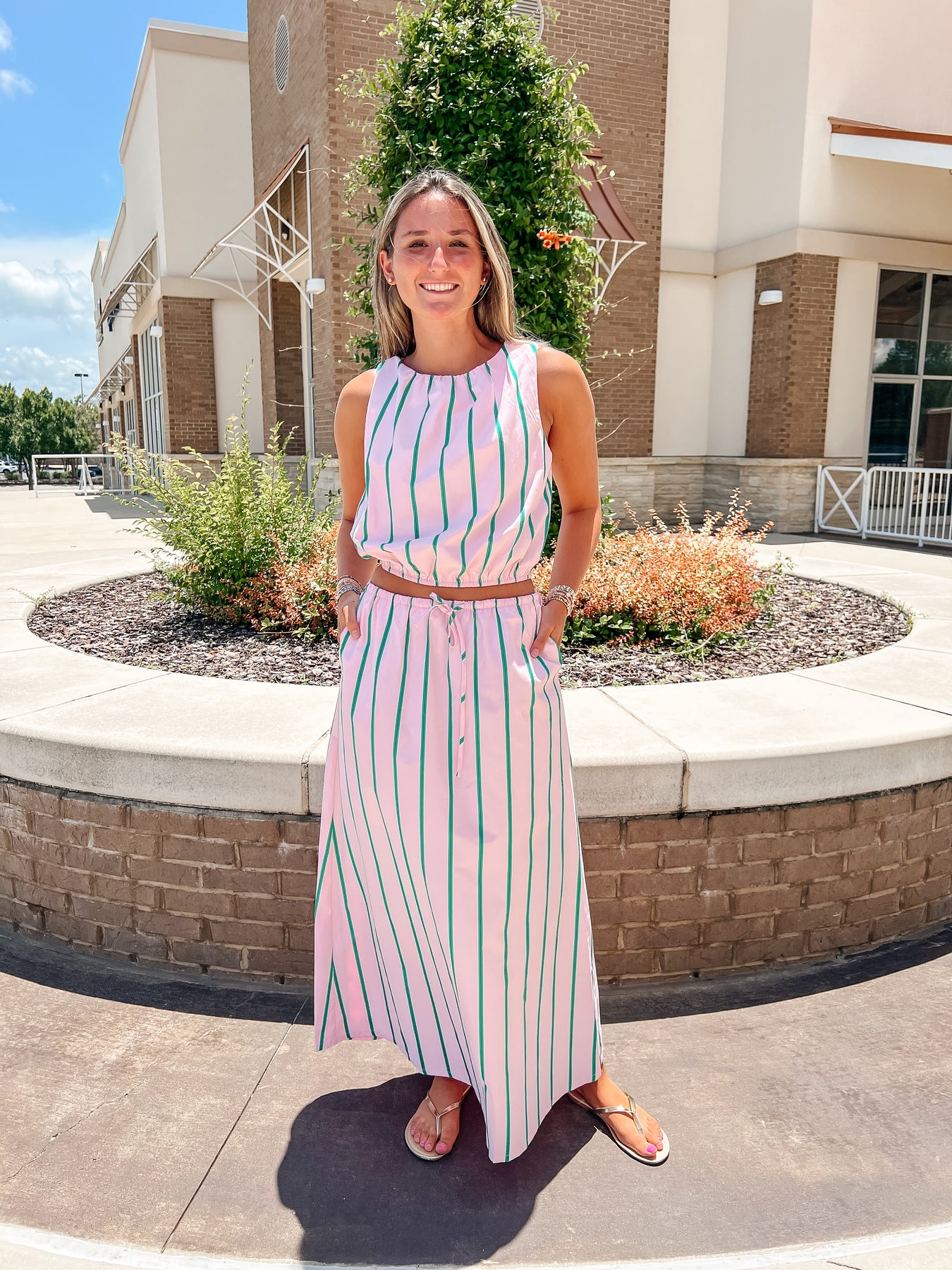 Add a pop of color to your wardrobe with this playful striped crop top. The cinched elastic hem creates a flattering blouson silhouette that pairs perfectly with the Elise Pinstripe matching skirt.