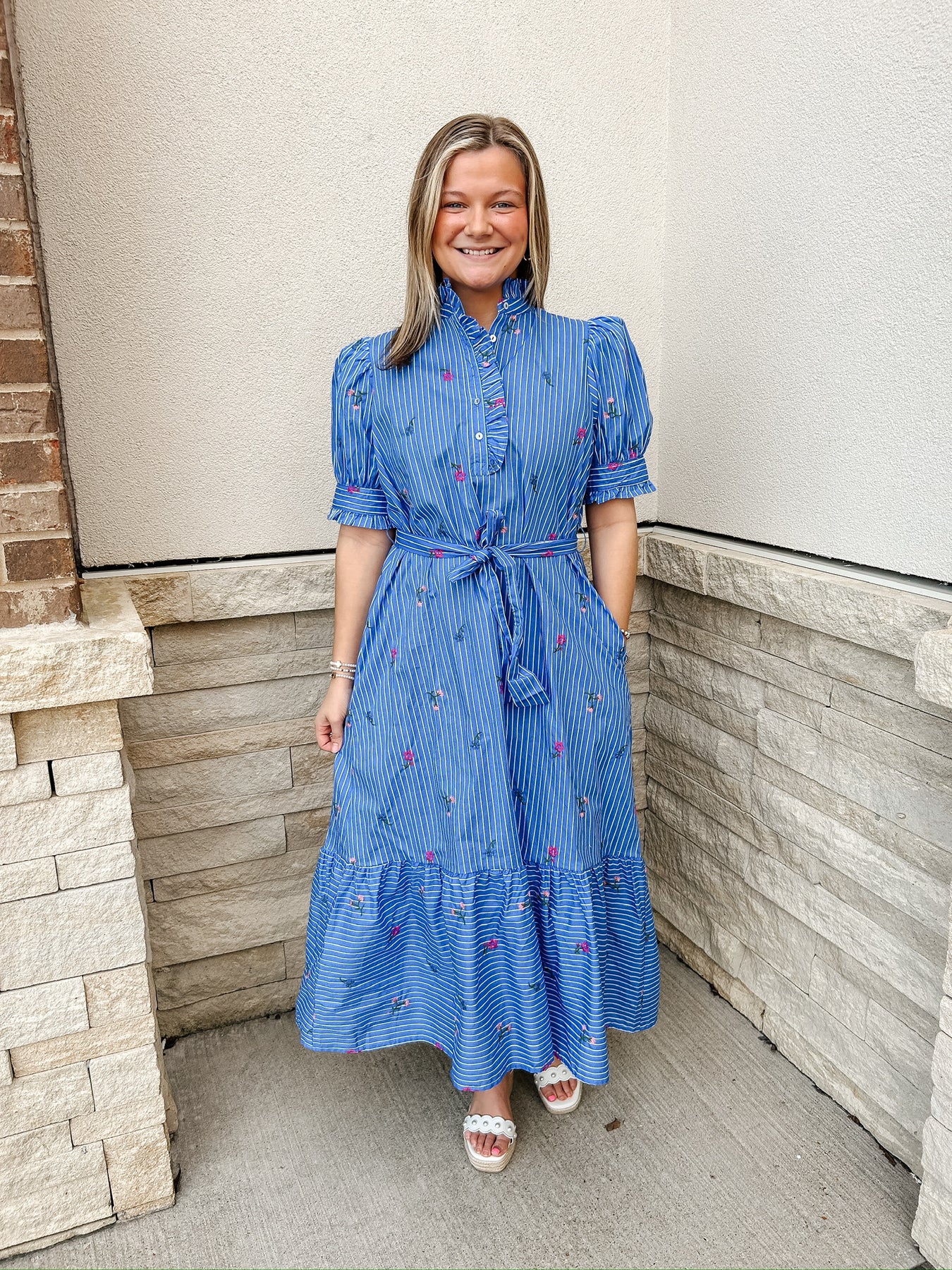 This breezy maxi combines nautical stripes with colorful floral embroidery for a look that’s both preppy and boho. Perfect for everything from garden parties to seaside strolls.