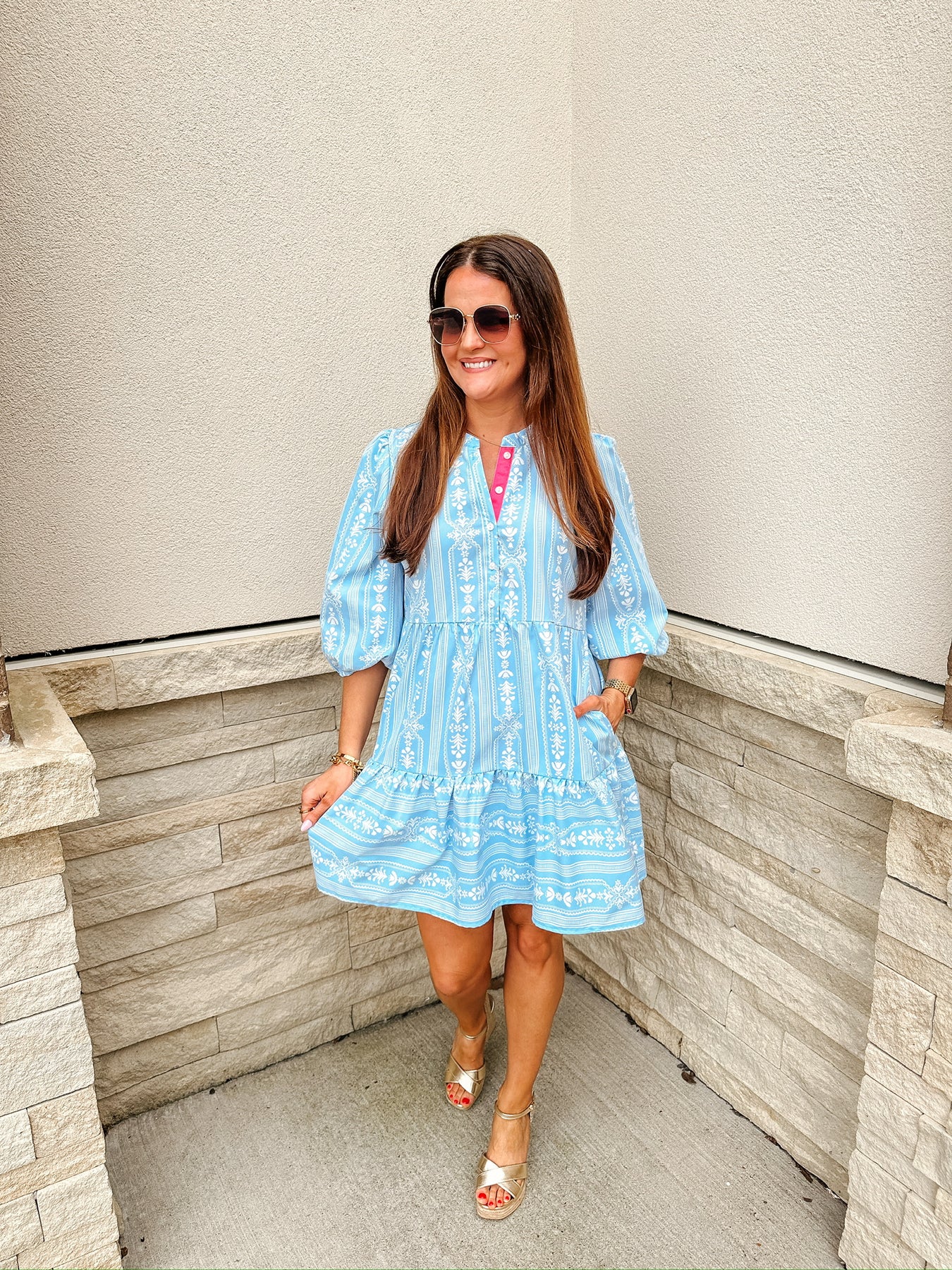 This breezy blue and white printed dress is a seasonal essential. It features a tiered skirt, a button-down notched neckline with a pop of pink, and elbow-length puff sleeves for a stylish, relaxed look.