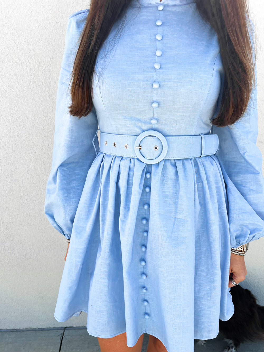 The Baylin Baby Blue Mini Dress features a mock neck with long sleeves. It displays faux front Dorset buttons and detachable belt. The back is a zipper closure. Pair this sweet dress with your favorite heels and accessories for the perfect Easter style!