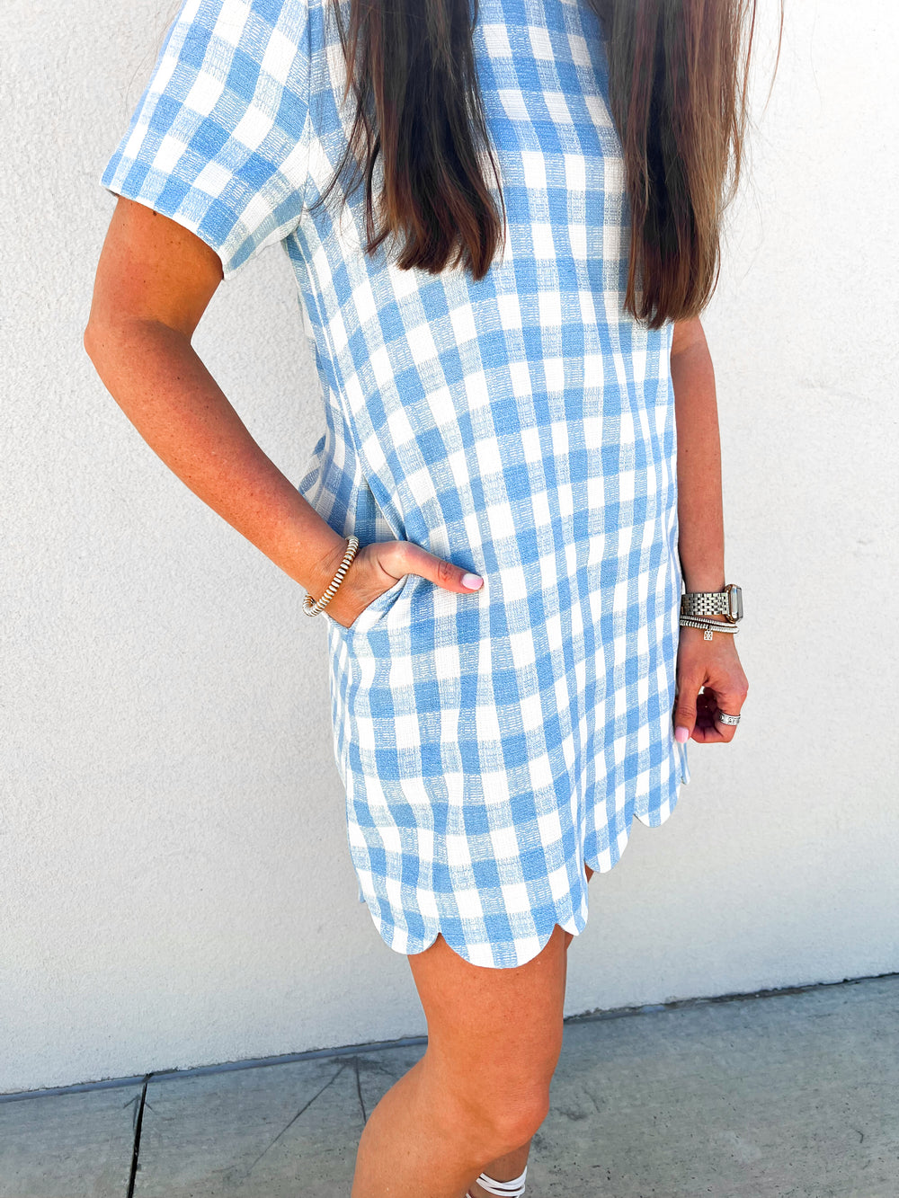This perfectly blue gingham tweed dress features a scalloped hemline and pockets. The back neck of the dress is complimented with Dorset buttons. Pair with your favorite heels for and effortlessly chic Easter look!